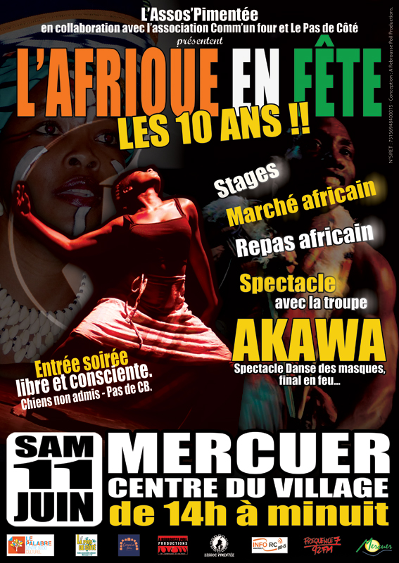 L’Assos Pimentée fête les 10 ans de « L’Afrique en Fête » ce samedi 11 juin à partir de 14h, en collaboration avec l’association « Comm’un Four » et le café associatif « Le Pas de Côté ». Au programme : stages, marché africain, repas africain, et spectacle avec la troupe AKAWA !!